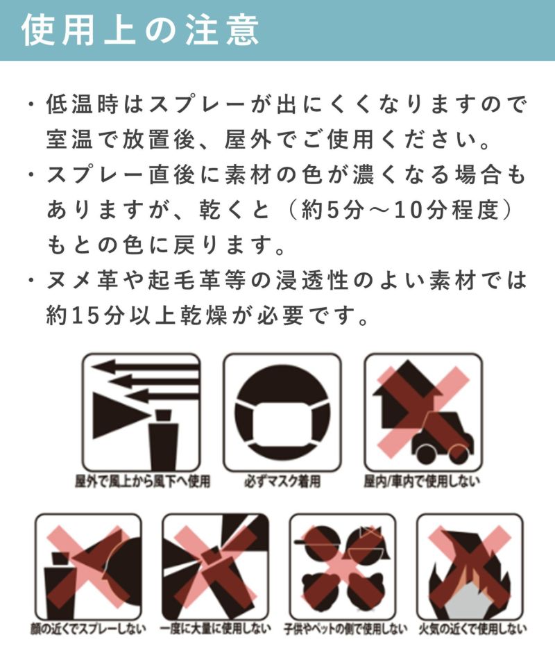 ※シミ・変色等の原因となりますので、至近距離からスプレーしないでください。