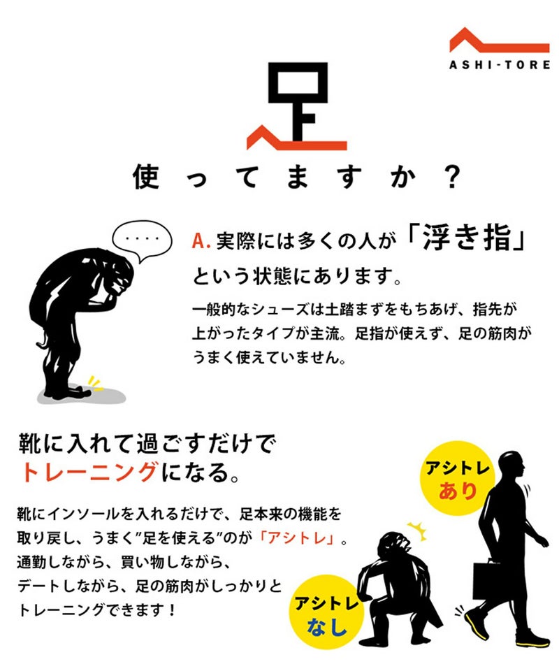 靴にインソールを入れるだけで、いつもの生活の中でうまく「足を使える」のがアシトレ。