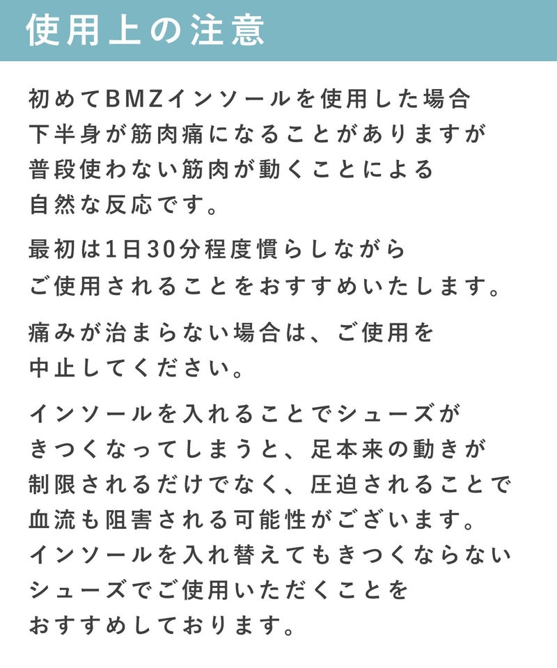 ・はじめてBMZインソールを使用した場合、下半身が筋肉痛になることがありますが、これはふだん使わない筋肉が動くことによる自然な反応になります。