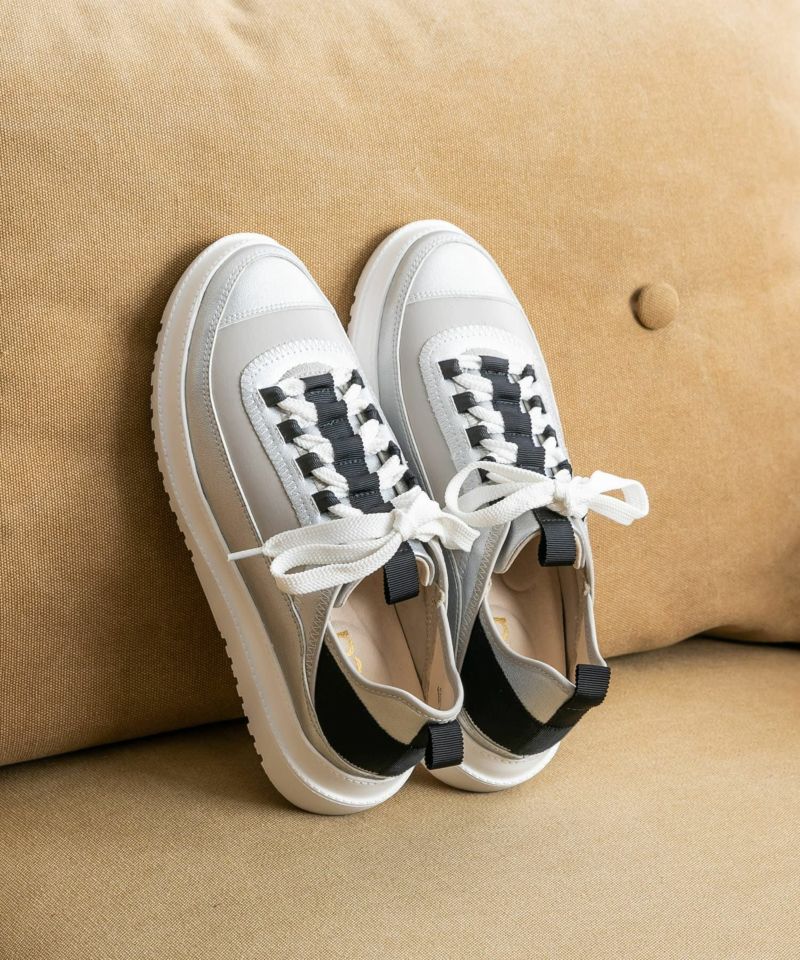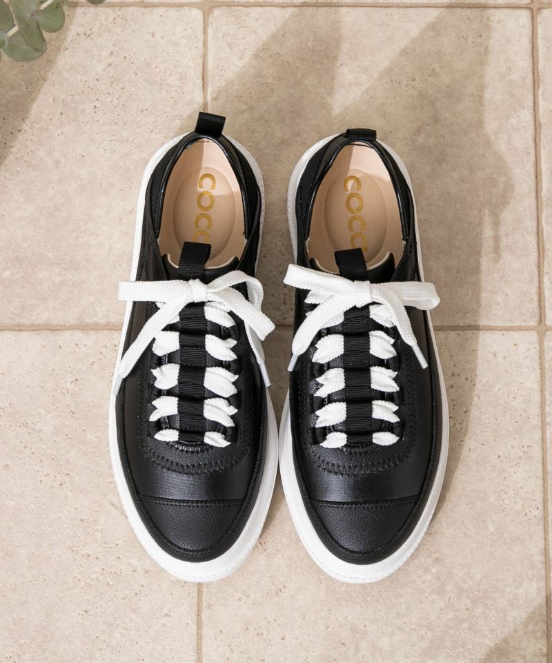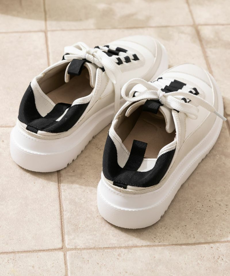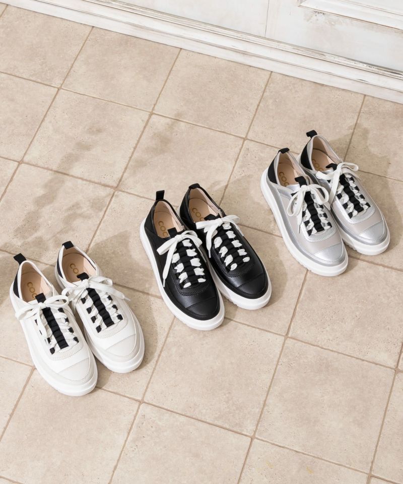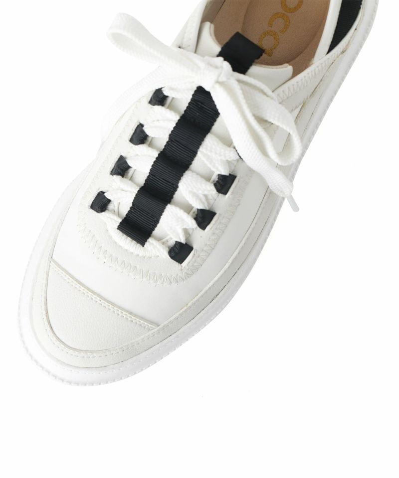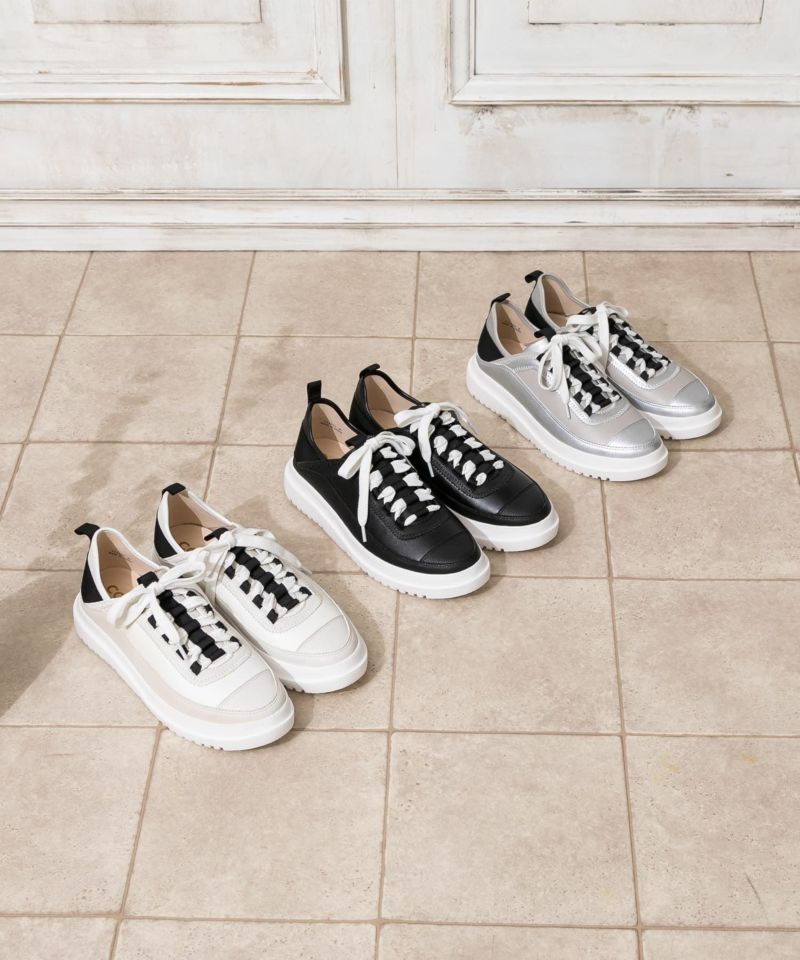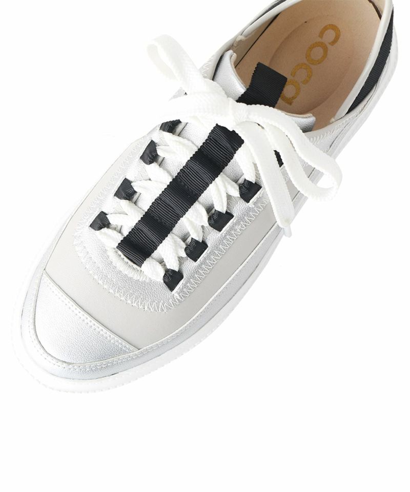 サイドのシューレース部分や踵にあしらったグログランリボンが、スニーカーにエレガントなアクセントを加え、カジュアルながらも上品な印象を演出します。