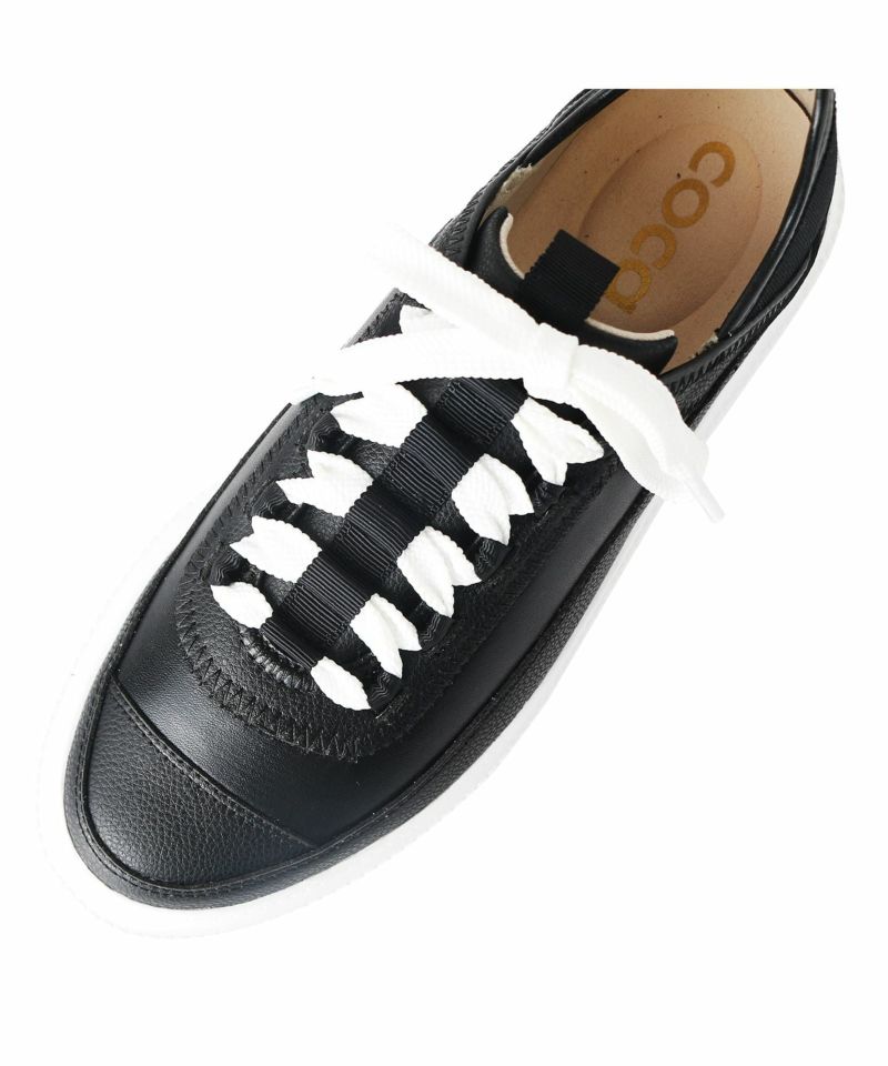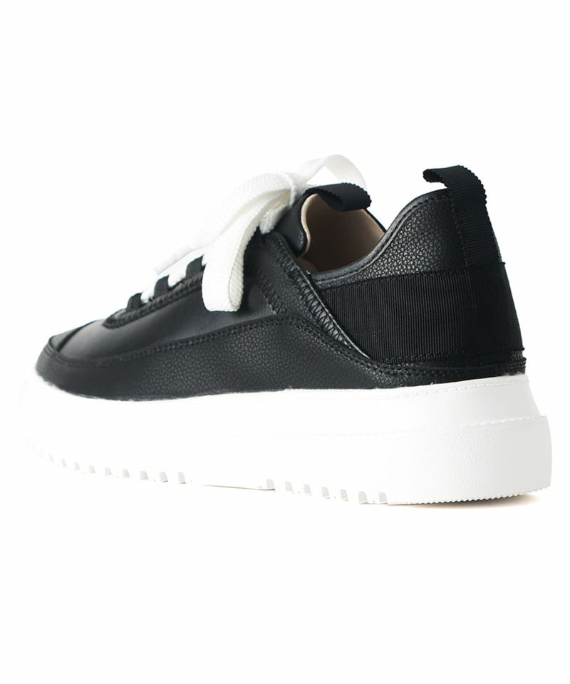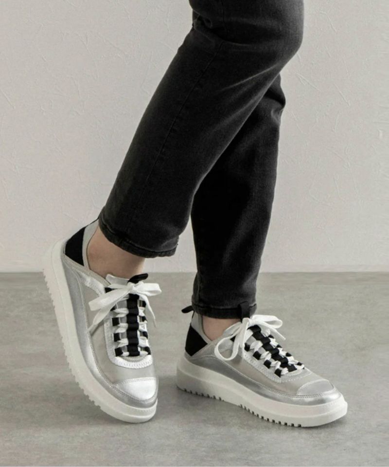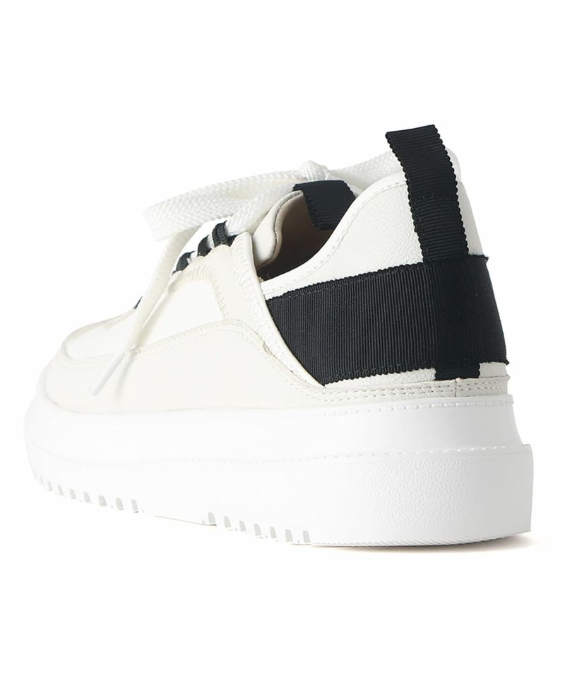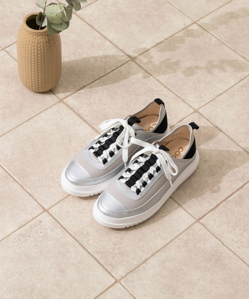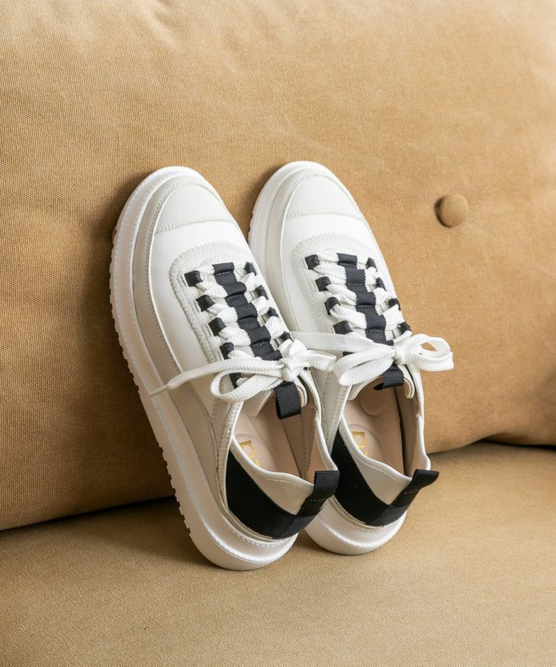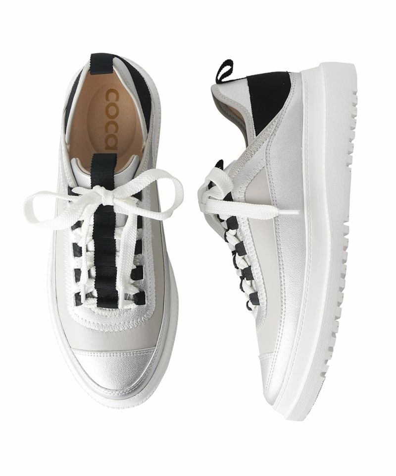サイドのシューレース部分や踵にあしらったグログランリボンが、スニーカーにエレガントなアクセントを加え、カジュアルながらも上品な印象を演出します。