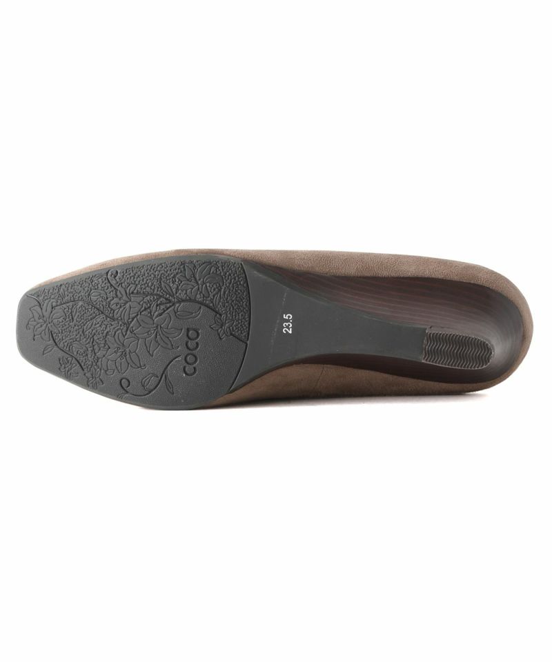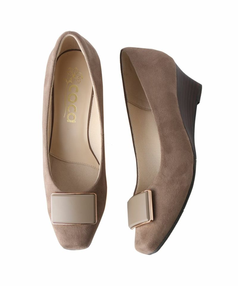 上品なマットスエードの質感が印象的な、ソフトスクエアトゥのウエッジパンプス。