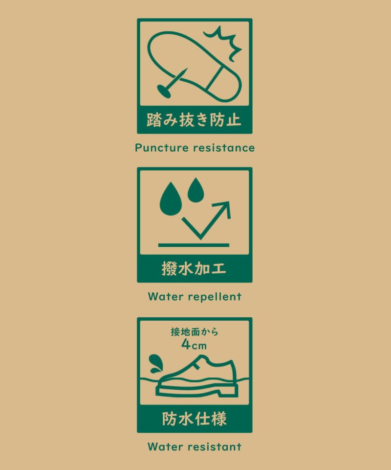 しかしその中底には、踏抜き防止シートを内蔵し、ガラス片や瓦礫など鋭利な物から足元をしっかりガードします。