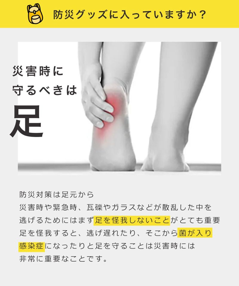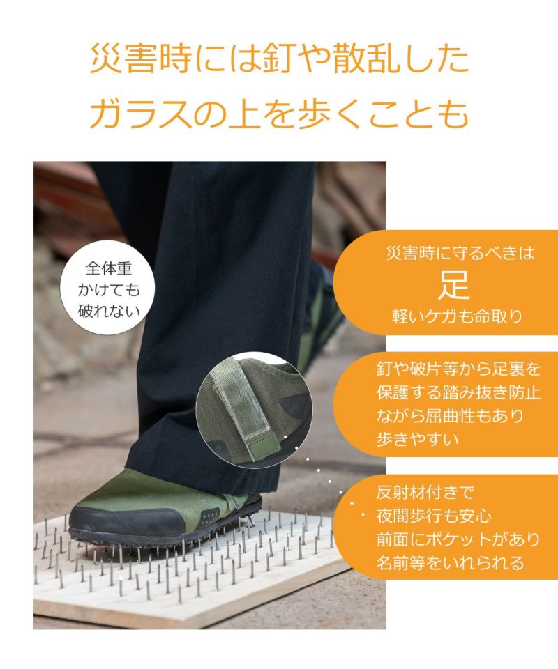 災害時に発生する火災や危険物から足元を守るだけでなく、刃物による切り傷や突き刺しからもしっかり保護します。