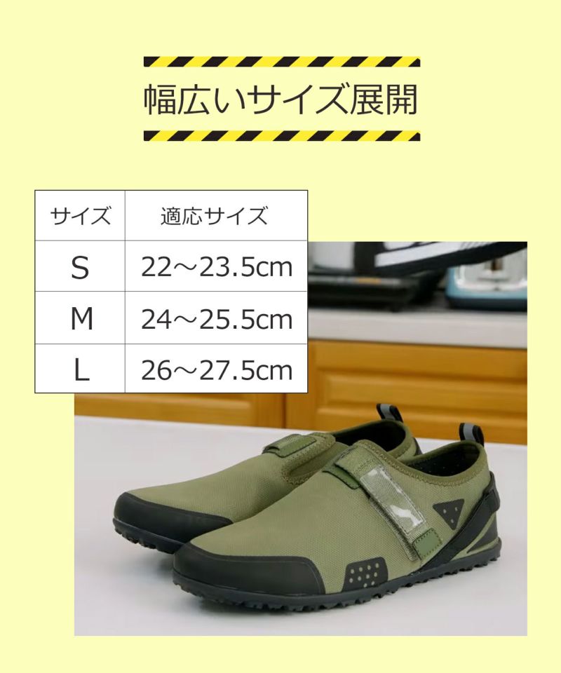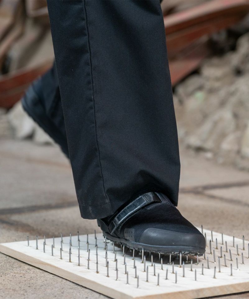 ・刃物が通りにくい防刃仕様で、ガラス片や鋭利な金属から足を守りケガのリスクを軽減